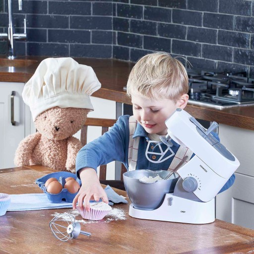 - У набір входить: іграшковий міксер Kenwood, 4 мірні чашки, велика миска для змішування, віночок, ергономічна качалка, лопатка для яєць.