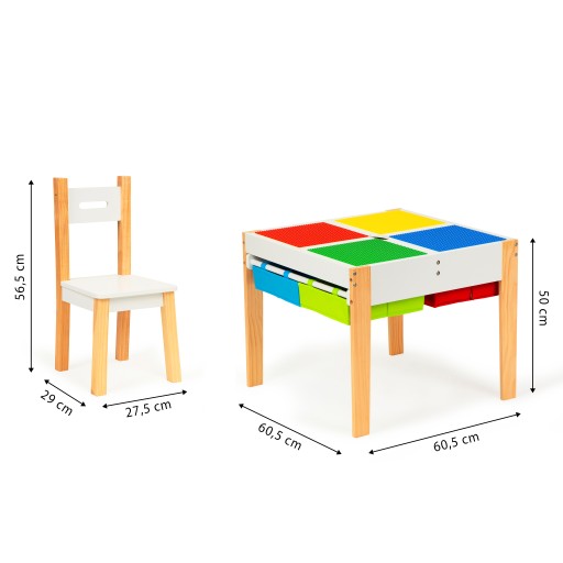 Стільниця складається з 2-х знімних елементів. З одного боку — різнокольорові дошки для розкладання блоків, з іншого — плоска поверхня, на якій можна малювати, малювати та виконувати інші творчі ігри.