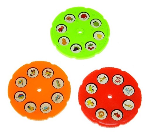 - 3 диски зі слайдами. Кожне коло має 7 картинок, що дає загалом 21 різний візерунок! (Тварини, транспорт, фрукти)
