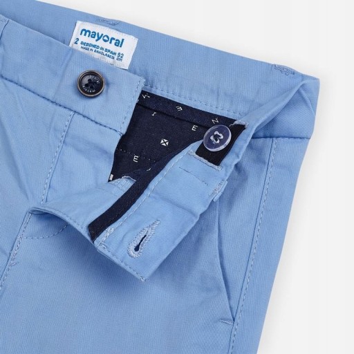 Штани чінос прямого крою. Пояс з регульованою гумкою та застібкою на блискавку та гудзик. Виготовлений з джинсової бавовни. Функціональні кишені як спереду, так і ззаду одягу. У зв'язку з вимогами безпеки менші розміри (2-5 років) мають імітацію шліфувки, без застібки, розміри понад 110 см - застібку на льотку :)