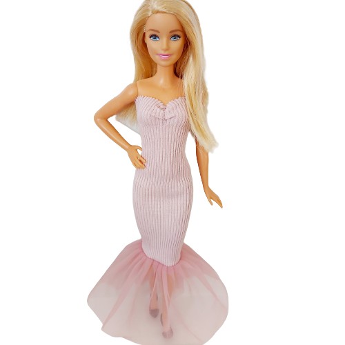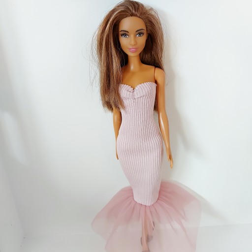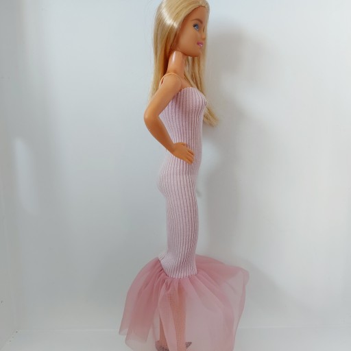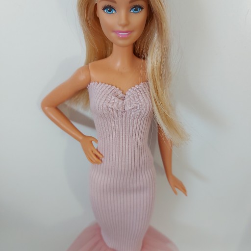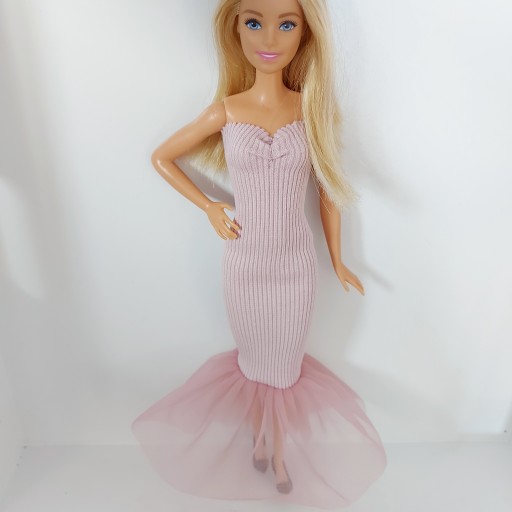 - сукня з трикотажу в рубчик рожевого кольору з воланом. (брудно-рожевий відтінок) Матеріал дуже гнучкий і адаптується до різних ляльок приблизно 30 см. Завдяки зручності використання та захисту ніжного волосся одяг не має липучок, оскільки завдяки еластичному матеріалу його легко надіти.