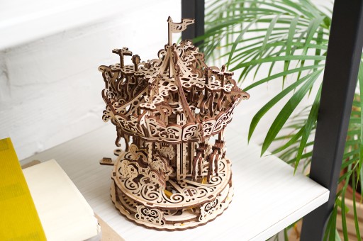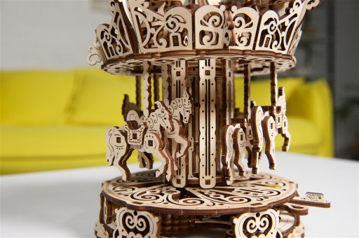 Унікальність цієї моделі обумовлена поглядом UGEARS на класичну карусель з використанням високоякісної деревини, завдяки чому карусель парку розваг набуває унікального вигляду з вишуканими деталями.