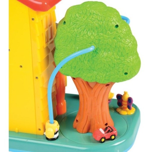 Хату стереже собака, собака гавкає та пищить. В саду пташка весело співає. Білка лізе на дерево, карта крутиться біля перил. Обертаючи метелика, маленька машинка буде об'їжджати ялинку, видаючи звук справжньої машини.