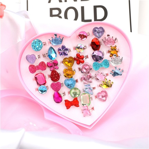 Дизайни 36 красивих візерунків дитячих ювелірних кілець у красивій коробці. Кольорові каблучки рожеві, блакитні, ти, фіолетові, нехай твоя маленька принцеса сяє. Ці кришталеві кільця мають різні стилі для щоденного одягу вашої дівчинки.