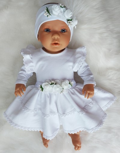 Сукня з білого бавовняного трикотажу (95% бавовна, 5% еластан), оброблена красивим бавовняним мереживом, застібається ззаду на кнопки, зав'язується поясом, прикрашеним дзвіночками.