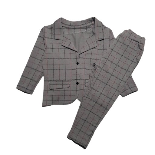 Класичний піджак з лацканами та імітацією кишень плюс брюки на широкій гумці класичного крою та звужених штанин.Завдяки додаванню еластану одяг не сковує рухів дитини, зручний