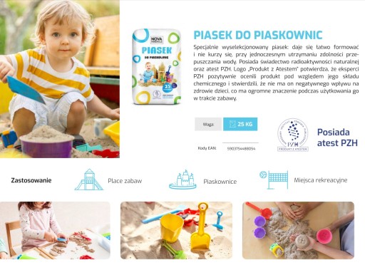 для вашої дитини Спеціально підібраний пісок: йому легко надавати форму, він не порошиться, зберігаючи здатність пропускати воду. Має сертифікат природної радіоактивності та сертифікат ПЗХ. Логотип «Товар із сертифікатом» підтверджує, що експерти PZH позитивно оцінили продукт за його хімічним складом і встановили, що він не має негативного впливу на здоров'я, що має велике значення при його використанні дітьми під час гри.