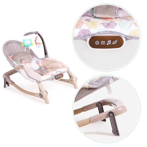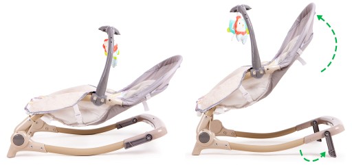 Досить двох рухів, щоб блокада склалася, і качалка перетворюється в стійку і зручну вишибалу, крісло. Коли малюк спить під час заколисування, ви можете використовувати опцію вишибала, завдяки якій малюк буде займати зручну позу для сну. Завдяки повністю регульованому сидінню, сидіння також добре працюватиме під час годування.