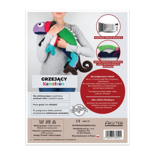 Зігріваючий хамелеон також стане чудовою іграшкою для вашої дитини, він її пригорне та зігріє, коли це необхідно. Однак для того, щоб перетворити його на іграшку, достатньо лише зняти вкладиш.Плюшевий хамелеон відрізняється не тільки великими розмірами, але й оригінальною формою, адже практично у кожної дитини є ведмедик або кролик. Як оригінальний талісман і м'яка іграшка, він стане чудовим подарунком для дівчаток і хлопчиків.Теплий Камелеон - це безпечний продукт для дітей, вироблений і протестований у Польщі органом сертифікації, акредитованим Польським центром акредитації.