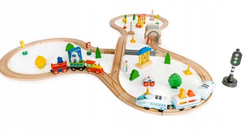У комплект входить потяг з електроприводом (батарейка АА). Локомотив легко тягне кілька причеплених до нього вагонів. Така розвага буде набагато кращою, ніж традиційні дерев'яні поїзди. Крім того, в набір входить другий локомотив, який малюк може сам привести в рух.
