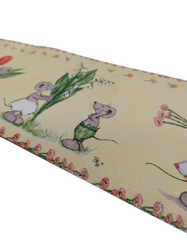 Візерунок: Мишки в сукнях і брюках граються з квітами. Тюльпан, конвалія, дзвіночок, кульбаба, полуниця.