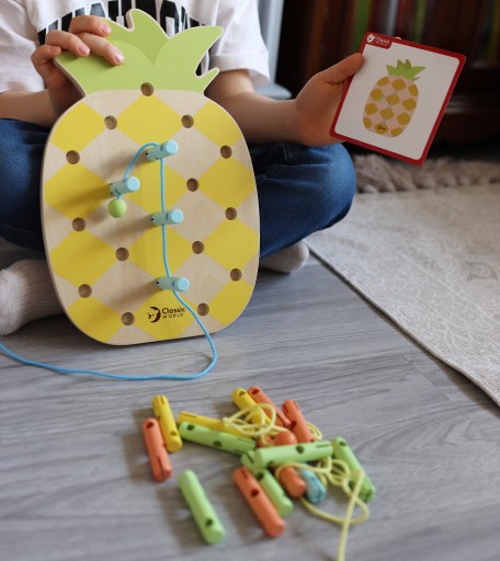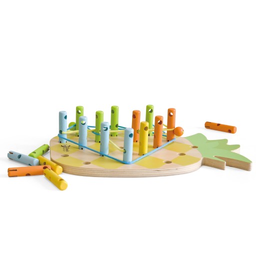 Wooden Threader Pineapple Pegs від бренду Classic World - це класичний набір різнокольорових кілочків з отворами, через які дитина протягує шнурок. Кільця можна розташувати будь-якими візерунками, що позитивно вплине на творчі здібності вашої дитини та ще більше стимулюватиме її уяву. Іграшка подарує вашій дитині багато годин розваг, тренуючи її увагу та концентрацію. Кожен елемент виготовлений з якісної деревини та пофарбований нетоксичною фарбою, що робить виріб абсолютно безпечним для дітей.