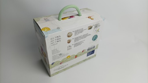 Посуд був виготовлений з порцеляни, а деталі – з нержавіючої сталі. Усі елементи можна мити в посудомийній машині.