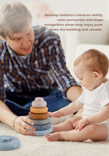 ãІграшка для раннього навчанняã- насичені кольорові кільця з тисненими візерунками допомагають дітям розпізнавати кольори та вивчати форми, а також стимулюють розвиток мозку. Діти можуть вдосконалювати свої практичні навички та творчі здібності під час складання. Як жувальна іграшка, він може заспокоїти біль при прорізуванні зубів і тренувати захоплення руками.
