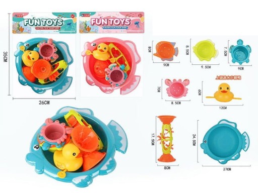 У набір входить: рибка - миска, заводна качечка, котушка і формочки - ситечка у формі морських тварин.
