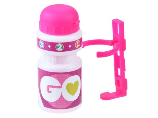 Рожевий кошик із написом GO та цифрами 3,2,1 кріпиться до керма автомобіля за допомогою стяжок 16 см. Дзвінок із такою ж графікою має пластиковий гачок для кріплення до керма. Пляшка для води з тримачем кріпиться за допомогою пластикових смужок довжиною 19 см.