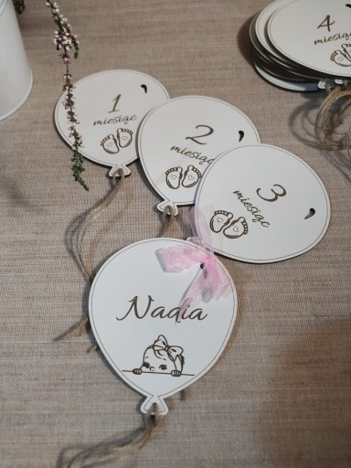 Набір дерев'яних повітряних кульок для фотографій на згадку про перші 12 місяців життя вашого малюка. Набір складається з 15 табличок і 13 повітряних кульок з ім'ям малюка. Інші два - мій власний вміст!
