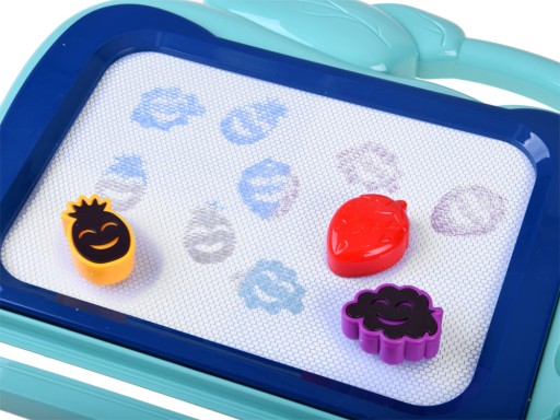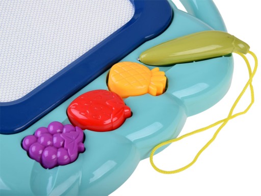 Барвистий альбом із фруктами — це пропозиція для кожного юного художника. Дошка в зошиті має кольорові елементи, завдяки яким маленький художник зможе малювати та розфарбовувати барвисті картинки. Щоб зробити роботу більш привабливою, у дитини є 3 штампи з фруктами у формі ананаса, полуниці та винограду. Художній твір з фруктовим присмаком напевно буде дуже соковитим і привабливим. Для малювання на дошці використовується стилус, захований у банані. Банан зі стилусом підвішується на шнурку, щоб завжди був під рукою і не загубився. Маленький зелений метелик використовується для стирання робіт з дошки. Метелик має силу стирати малюнки та картини, просто перемістіть його зліва направо і навпаки, робота буде стерта.