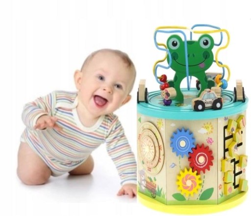 Інтерактивний дерев'яний куб дуже барвистий - яскраві кольори стимулюють уяву найменших і стимулюють їхню творчість. З іншого боку, маніпуляції з рухомими елементами допомагають наймолодшим практикувати маленькі пальчики, ручні навички та координацію очей і рук.