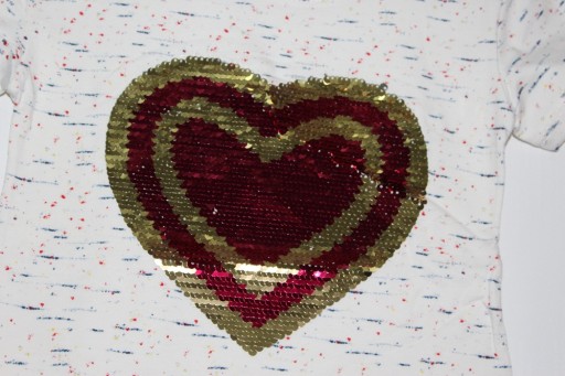 На лицьовій стороні аплікація з СЕРЦЕМ, вкрита чарівними двосторонніми блискітками, які змінюють колір при дотику до руки. Золоті блискітки перетворюються на срібні.