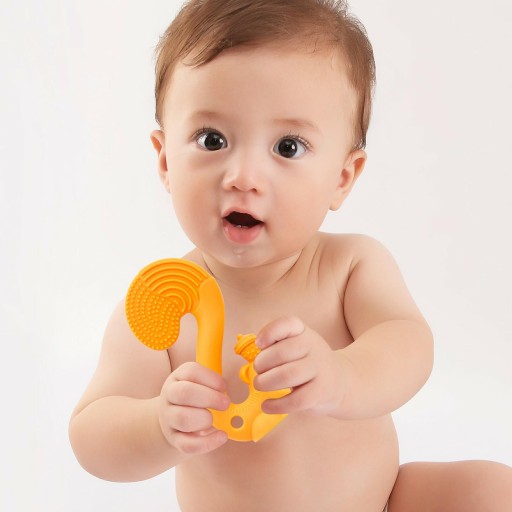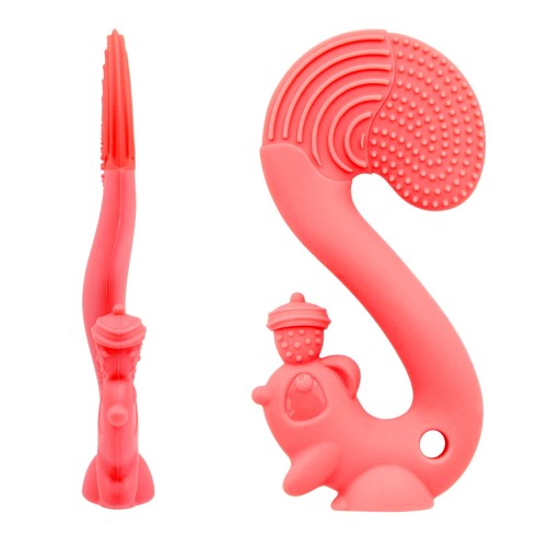 М'який S-подібний прорізувач для білок був розроблений для найменших дітей. Різні конструкції прорізувача масажують ніжні ясна та заспокоюють біль під час прорізування зубів. Правильна форма і розмір дозволяють дитині легко триматися. Також його можна використовувати для подачі, наприклад, каш і пюре. Форма білочки та її кольори заохотять малюка до ігор. Його безпечно і легко жувати навіть охолодженим. Ви можете використовувати його в посудомийній машині, мікрохвильовій печі та морозильній камері.