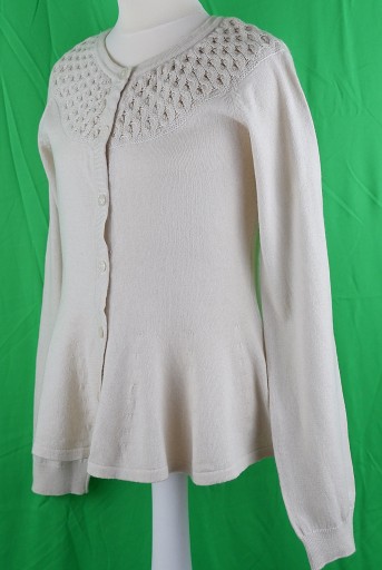 Елегантний светр ванільного кольору. Кокетка напівкругла з декоративним переплетенням. Розкльошений низ. Рукава в рубчик.