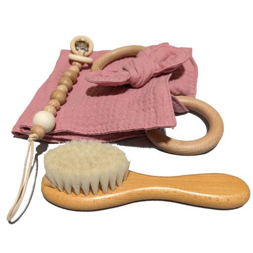 підгузниквін відмінно підійде в перші моменти життя дитини, слугуючи сповиванням або допоміжним засобом для підстрибування.Практична підвіска-пустушка, не дасть дитині її втратити і пустушка завжди буде з ним.Дерев'яний прорізувач з бантикомвкраде серце кожного малюка.Природна форманаші іграшкибуде стимулювати допитливістьнаймолодших і заохотить найменших досліджувати.Щітка з м'якою щетиноює корисним засобом для догляду за дитиною, особливо в контексті догляду за ніжною шкірою голови та волоссям дитини.