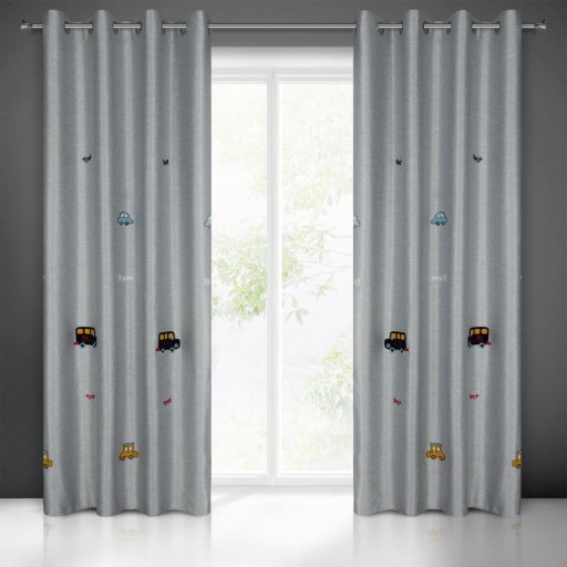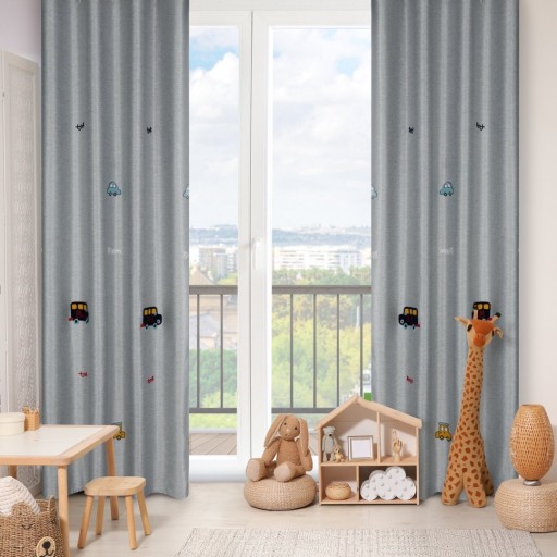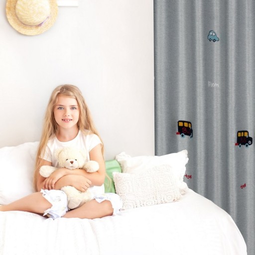 Готова штора прикрашена вишивкою по дитячому візерунку. Ширина: 140 см, довжина: 250 см, колір: сріблястий, Склад: 100% поліестер.