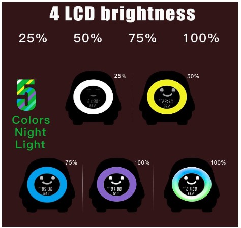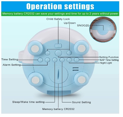 - Цей годинник потребує живлення через USB, а вбудований акумулятор використовується лише для збереження налаштувань, коли живлення вимкнено. Чарівні кольорові вогні та заспокійлива музика створені, щоб допомогти малюкам краще засинати та відчувати себе в безпеці, коли вони засинають у темряві!