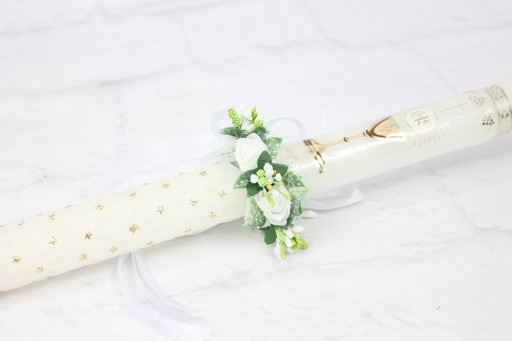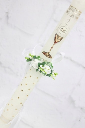 Ніжна і красива прикраса для причасної свічки в стилі бохо, повна білих дзвіночків, загорнутих у шифон, прикрашена листочками плюща, схожими на сердечка та перлини.