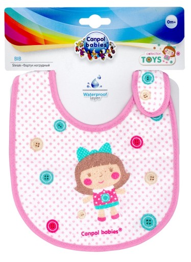 Нагрудники з колекції «Іграшки» з малюнком іграшкової машинки або ляльки захистять одяг вашої дитини від забруднення під час їжі. Виготовлені з м'якої бавовни, вони не дратують ніжну шкіру малюка, а фольга на нижній стороні захищає одяг. Зручна застібка-липучка.