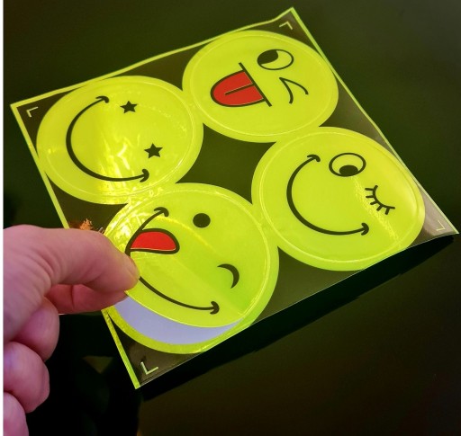 У нашій пропозиції ви знайдетевисокоякісні світловідбиваючі наклейки. Вироби виготовленівиготовлений із міцної мікропризматичної фольги, доступний у чотирьох візерунках - щасливі обличчя. наклейкидуже добре відбивають світлозавдяки якому ви, ваша дитина чи інша близька вам людина стаєте більшевидно водіямта інших учасників дорожнього руху.