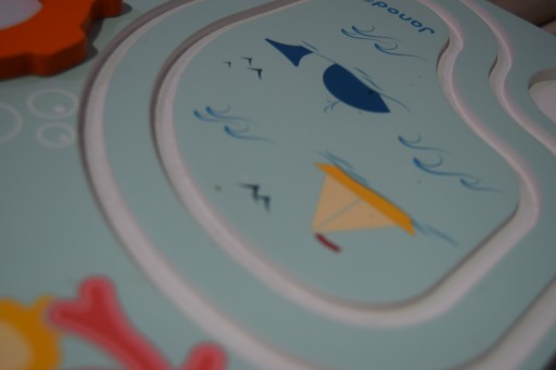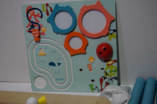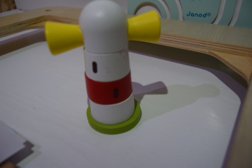 На стільниці - гра в шестерні з маленькими кумедними восьминогами, три рибки з кульками, рибка для штовхання і доріжка з маяком для складання.