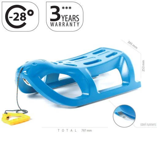 Стійкі та зручні санки Prosperplast Sea Lion, передня частина яких нагадує милу мордочку маленького моржа, обіцяє чудове задоволення. Санки виготовлені з високоякісного пластику, стійкого до низьких температур, а для кращого ковзання на днищах встановлені металеві полози. Вони мають сертифікат CE. Крім того, в набір входить кольорова мотузка з ручкою-тягою.
