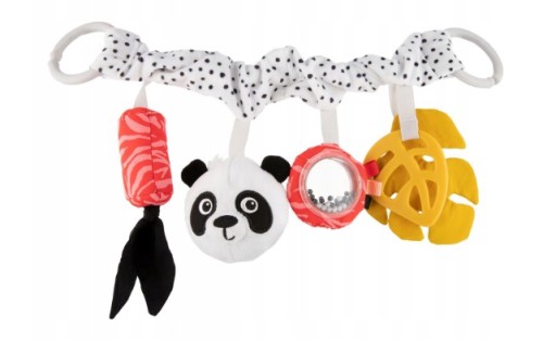 Ніжні, але контрастні кольори заохочуватимуть вашу дитину грати. Кожен елемент підвіски виконує різну функцію, дзвіночок з бантиком видає ніжні звуки, м'яка плюшева панда, виготовлена з приємного на дотик і м'якого матеріалу, зберігає форму при натисканні, дзеркальце, оточене різнокольоровими бирками з брязкальцем і два листочки, один приємно шелестить, а другий у вигляді прорізувача, принесе полегшення під час відрижки.