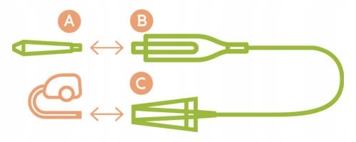 - Візьміть дитину на руки або покладіть на коліна. Прикладіть наконечник А до ніздрі та зніміть нежить на 5-10 секунд. Повторіть для другої петлі.