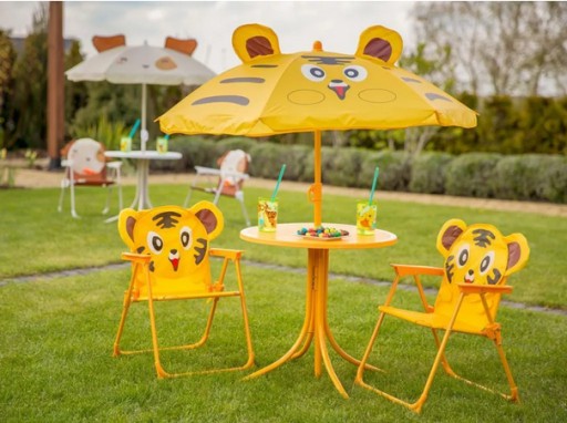 - Завдяки такому комплекту меблів ви створите практичний і функціональний простір для дітей, який складається з: столу, парасольки і двох стільців.