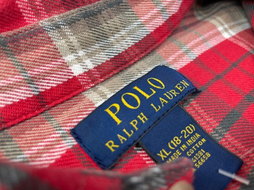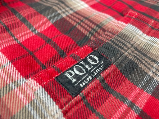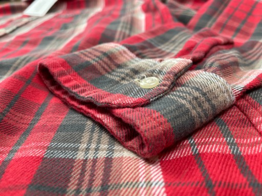 Червона сорочка з коміром, сіро-біла клітинка у вінтажному стилі. Застібається на кнопки. Має дві кишені на грудях. На одній з них логотип компанії (злегка затертий). Манжети на ґудзиках.