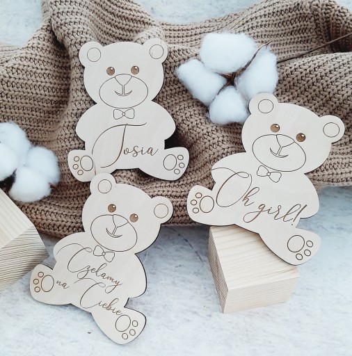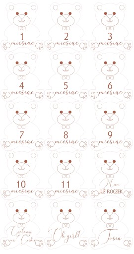 У набір входять 15 ведмедиків:місяців з 1-11, Мені рік, Ми чекаємо на тебе, Ой дівчинка чи Ой хлопчик, Ім'я дитини.