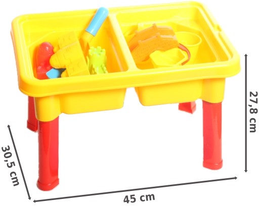 Столик має дві камери, одна для піску, інша для води.Ніжки знімаються, пісочниця ідеально підходить для маленьких дітей. Пісочниця додатково має кришку, поставивши її на стіл, можна використовувати, наприклад, для малювання, їжі або ігор як вдома, так і на вулиці.