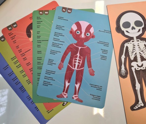 - У набір входить: 63 магніти, дошка для розкладки 28 х 18 см, 15 карток на 12 мовах також польською.