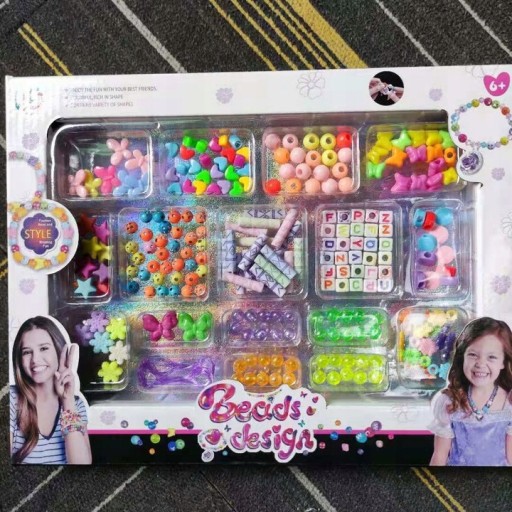 У набір входять намистини різних розмірів, кольорів і форм, а також нитки для протягування.