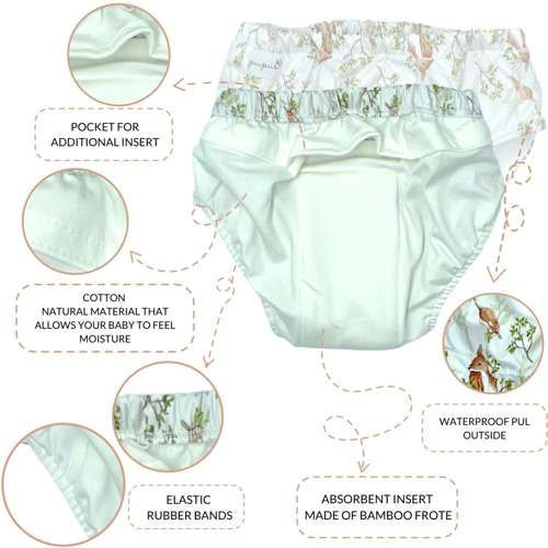 - виготовлений із водонепроникної тканини PUL зовні та бавовни кольору екрю всередині
