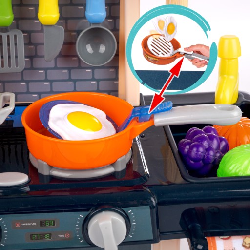 - 42 аксесуари в комплекті (фрукти, овочі, каструлі, тарілки, столові прилади, коробки для їжі)