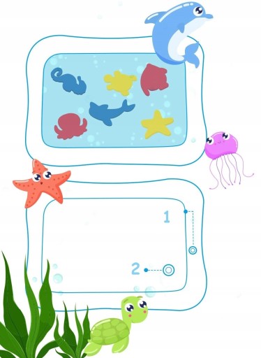 - Внутрішня частина килимка міститьплаваючі елементи з різними формами водних істотякі після наповнення килимка водою дрейфують на фоні океану та коралового рифу, привертаючи увагу дитини.