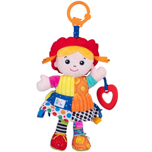 Лялька у вигляді кулона відмінно підійде як для гри вдома, так і для прогулянки в колясці. На Ніколь сукня з різнокольорових складок, оздоблена тканинними ярликами. Різноманітні текстури матеріалів, з яких він виготовлений, стимулюють зір і дотик малюка, таким чином підтримуючи розвиток його когнітивних навичок. У ляльки в руці є прорізувач з виступами, а в животі прихований дзвіночок, який видає щасливий звук, коли іграшку трясуть. Практична ручка полегшує кріплення кулона в будь-якому місці. ЛЯЛЬКА BALIBAZOO BABY, ПІДВІСКА, ПРОРЕЗИВАЛЬНИК, БРЯЗКАЛО