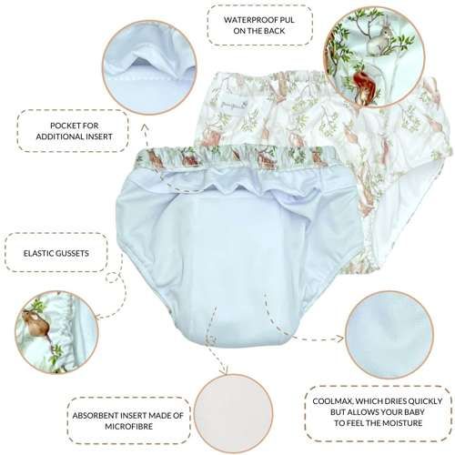 У трусики вшита вбираюча вставка, але при цьому є кишеня для додаткової вставки, якщо ваша дитина багато пісяє. Наші маленькі вставки з бамбука або мікрофібри підходять до трусиків.