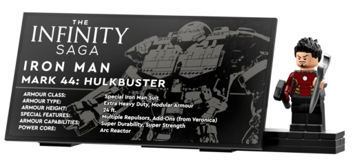 У моделі ви знайдете точні зображення елементів з фільму. Під темно-червоною бронею та стратегічно розташованими золотими клапанами є простора кабіна, з якої бронею керує LEGO Marvel Iron Man (76206) — продається окремо. Також містить табличку з фактами та мініфігурку Тоні Старка.