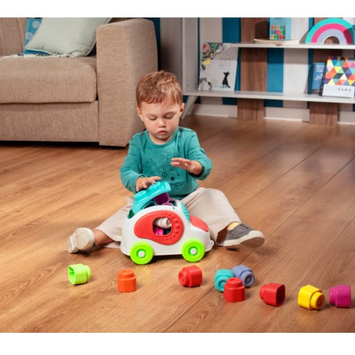 - Для вставки і вилучення фігурок служать м'які бічні вікна автомобіля, що виконують функцію «сортера». Сортер можна назвати чи не першою розвиваючою іграшкою для дітей. За допомогою такої іграшки дитина легко вивчить кольори, форми і розміри. Крім того, сортер сприяє розвитку пам'яті та концентрації, розвиває логіку, допомагає вчити цифри.