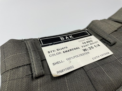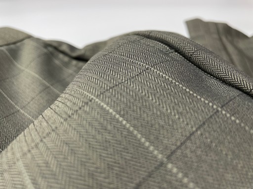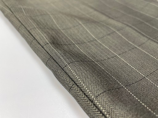 Класичні елегантні штани для хлопчика. Вони темно-сірого кольору з відтінком хакі. Домінуючим малюнком є візерунок «ялинка» з більшою сіткою. Мають кишені спереду і ззаду. Застібається на блискавку і гачок. Додатковою перевагою виробу є шлевки.